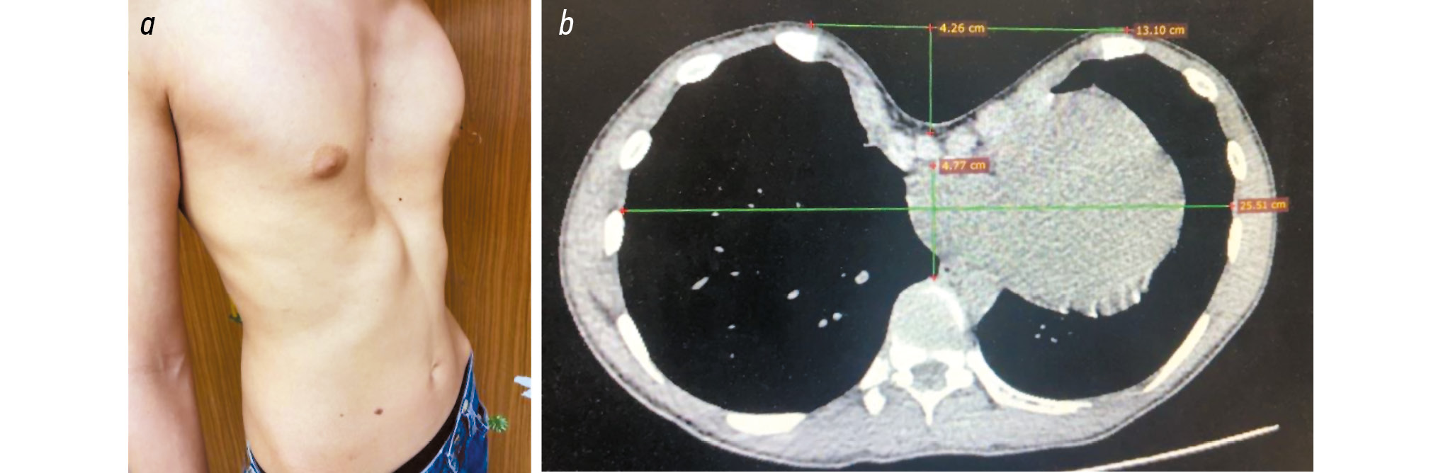 Рис. 1. Пациент 16 лет: a — воронкообразная деформация грудной клетки; b — компьютерная томография грудной клетки (индекс Галлера =5,4 см).
