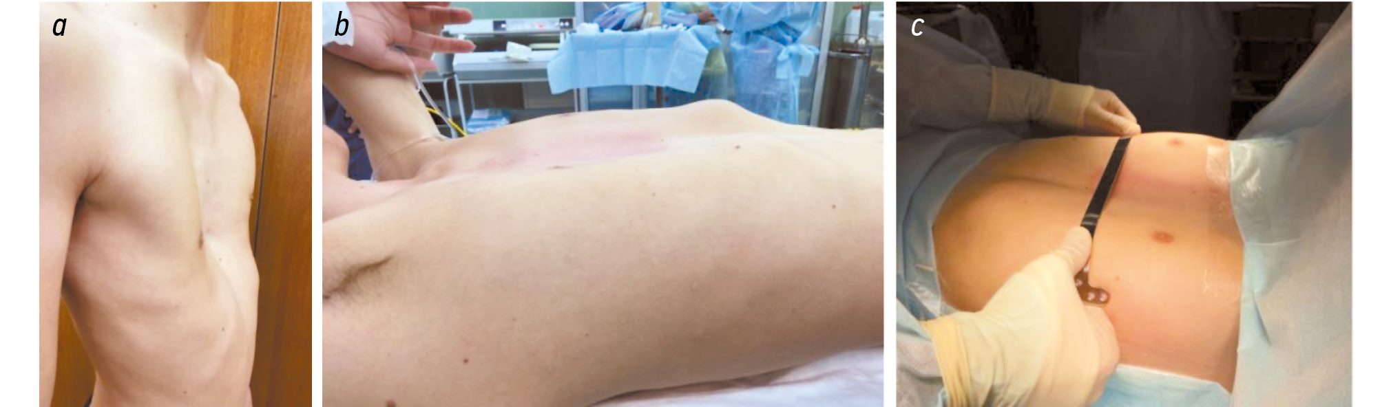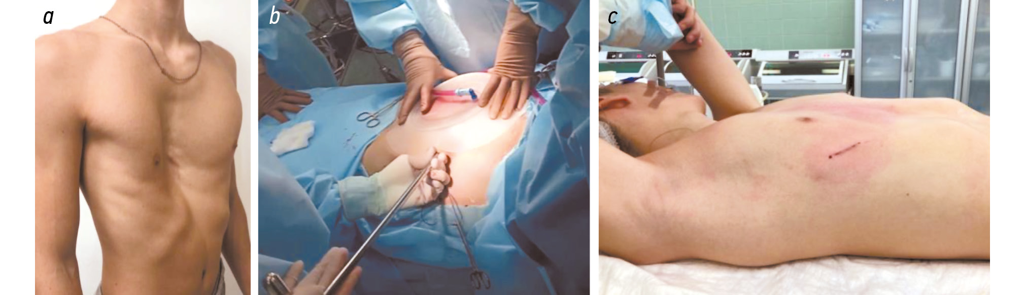 Рис. 7. Предоперационное использование вакуумного колокола у пациента 16 лет с воронкообразной деформацией грудной клетки: a — до использования вакуумного колокола (глубина 2,6 см); b — вид перед операцией (после 4 сут использования вакуумного колокола); c — интраоперационная примерка пластины (глубина деформации 0,7 см).
