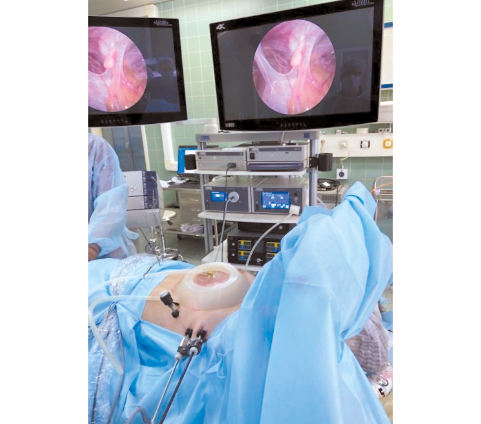 При ВДГК после стернотомии торакопластика по Нассу выполняется с помощью торакоскопии и интраоперационной элевации грудины. В положении больного на спине с поднятыми и фиксированными к дуге руками в левую плевральную полость устанавливаются 3 троакара, поддерживают карбокситоракс с давлением 6–8 мм рт. ст. и скоростью потока 10 л/мин. После ревизии переднего средостения и левой плевральной полости устанавливается ВК соответствующего типоразмера и подключается к операционному аспиратору (рис. 4).