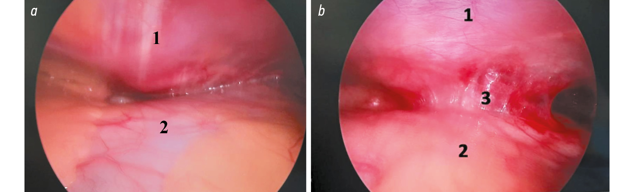 Рис. 5. Интраоперационные фотографии: a — до установки вакуумного колокола (1 — внутренняя поверхность грудной стенки, 2 — сердце); b — элевация грудины после установки вакуумного колокола (1 — внутренняя поверхность грудной стенки, 2 — сердце, 3 — спаечный процесс в переднем средостении).