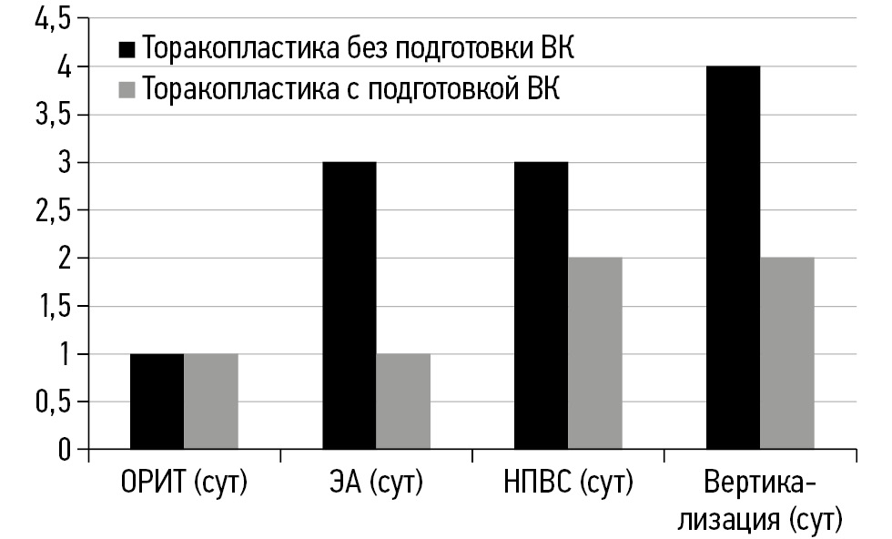 Рис. 8. Течение послеоперационного периода после торакопластики по Нассуc подготовкой и без подготовки вакуумным колоколом: ОРИТ — отделение реанимации и интенсивной терапии; ЭА — эпидуральная анестезия; НПВС — нестероидные противовоспалительные препараты; ВК — вакуумный колокол.
