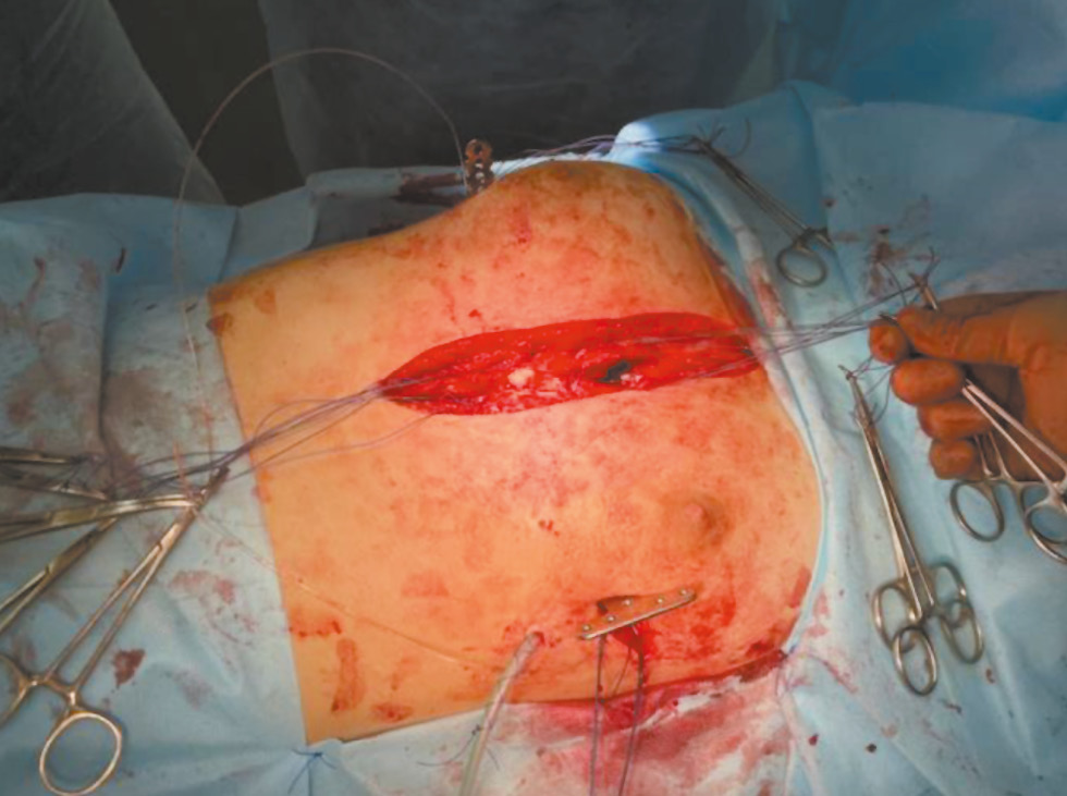При глубоких ВДГК и деформации по типу «Grand Canyon» торакопластика по Нассу выполняется в положении больного на спине с поднятыми и фиксированными к дуге руками (рис. 3, c). При разметке операционного поля маркером отмечаются места кожных разрезов в проекции межреберий, где планируется введение проводника. Выполняются разрезы с двух сторон, мышцы расслаиваются по ходу волокон и формируются встречные тоннели под грудными мышцами. Вокруг рёбер с двух сторон предварительно проводится нить (Vicril 1,0–2,0) для последующей фиксации концов пластины. Далее наиболее ответственный этап операции — введение инструмента-проводника слева направо. Инструмент- проводник проводится по сформированному тоннелю до места его проведения за грудиной. Следующим этапом устанавливается ВК соответствующего типоразмера и подключается к операционному аспиратору (рис. 3, b). Под воздействием вакуума достигается максимальная элевация грудины, которая контролируется через смотровое стекло ВК. После достижения элевации грудины трубка ВК перекрывается и отключается от аспиратора. Проводник проводится в намеченной точке межреберья и конец инструмента- проводника извлекается с противоположной стороны. ВК демонтируется и за извлечённый конец инструмента- проводника фиксируется прочная леска. Инструмент- проводник извлекается и к проведённой за грудиной леске привязывается пластина. Пластина проводится таким образом, чтобы Т-образный конец расположился слева. Затем пластина ротируется на 180° в правильное положение, что приводит к коррекции деформации грудной клетки. На последнем этапе корригирующая пластина фиксируется, и раны послойно ушиваются (рис. 3, c).