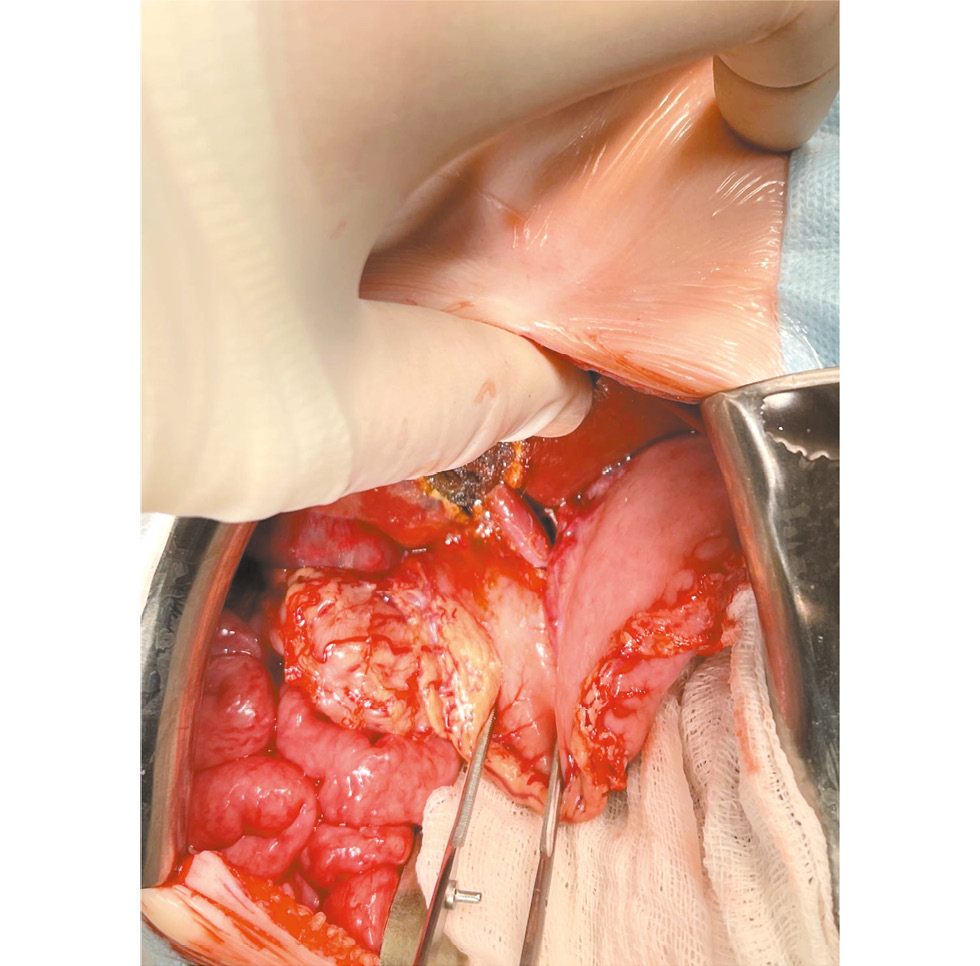 После обследования ребёнку проведено мезентерико- портальное шунтирование (рис. 2). В качестве доступа была выбрана верхняя срединная лапаротомия. Далее по ходу круглой связки печени была выделена и вскрыта левая ветвь воротной вены, выделены верхняя брыжеечная и селезёночная вены. В качестве шунта была использована левая внутренняя ярёмная вена. Диаметр анастомозов между шунтом, верхней брыжеечной и левой воротной веной составлял 7–8 мм. После интраоперационной проверки кровотока раны были ушиты наглухо. В послеоперационном периоде на протяжении 3 мес. ребёнок получал антиагрегантную терапию (аспирин в дозе 15 мг в сут) и ингибиторы протонной помпы в стандартной возрастной дозировке.