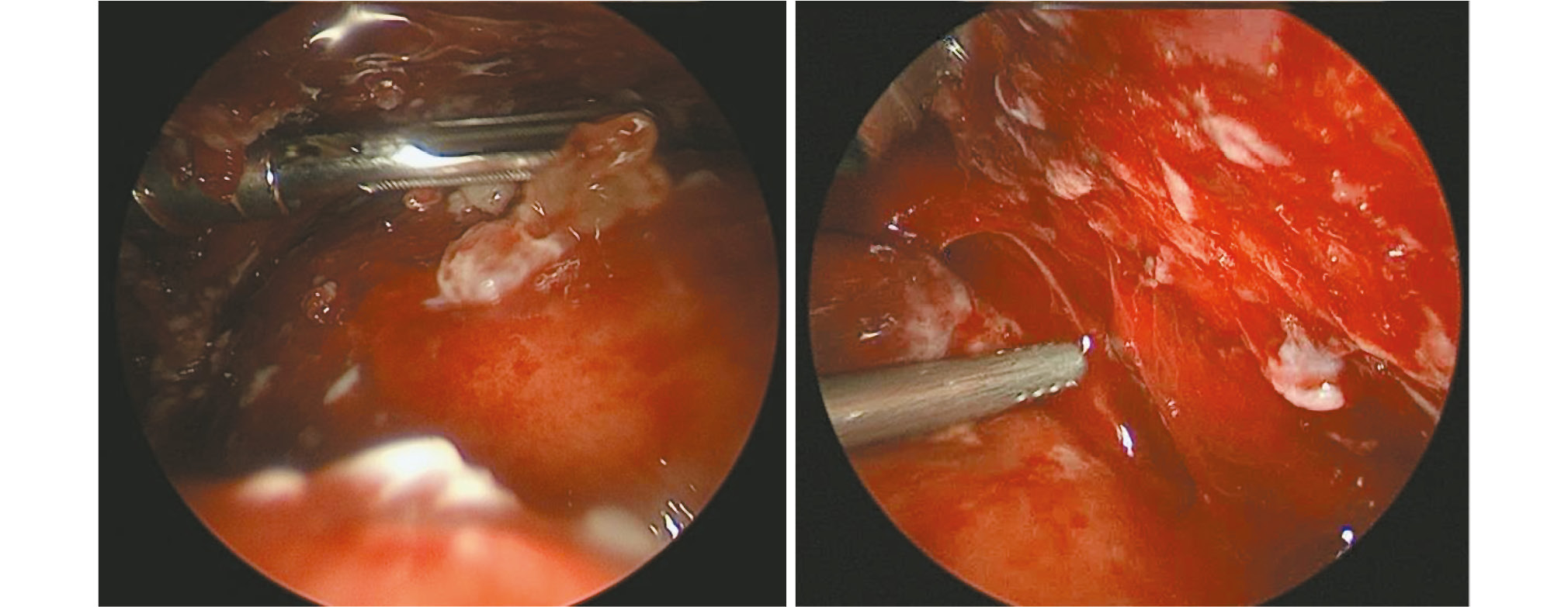 Оперативное вмешательство в обеих группах заключалось в обеспечении доступа в плевральную полость: сначала устанавливали оптический торакопорт в 5 межреберье по лопаточной линии, затем под визуальным контролем устанавливали 2 рабочих торакопорта — в 6–7 межреберье по передней подмышечной линии и в 7 межреберье по задней подмышечной или лопаточной линии. При наличии дренажного канала оптический торакопорт устанавливали вместо дренажа — 6 (23,1%) больных. Затем проводили ревизию плевральной полости с механическим разделением плевральных спаек и шварт (рис. 1). После эвакуации гноя и основной массы фибрина проводили УЗК плевральной полости и лёгкого, последовательно используя все имеющиеся доступы. Фибриновые массы по завершении этапа кавитации эвакуировали электроотсосом. Кавитацию проводили ультразвуковым аппаратом «SONOCA-190» (Soring, Германия) с частотой 25 кГц. Продолжительность и интенсивность режима воздействия определялись стадией плеврита, физическими характеристиками фибриновых плёнок, выраженностью деструктивных изменений в лёгочной ткани и возрастом пациента. В среднем время экспозиция УЗНЧ составляла 5–7 мин в режиме 40–60%. Заканчивали операцию установкой двух дренажей из нижних точек диафрагмальных синусов через рабочие доступы по направлению к верхней апертуре грудной клетки для оптимальной эвакуации плеврального выпота. Случаи внутрилёгочных абсцессотомий завершали постановкой дополнительного спирального дренажа в полость абсцесса.