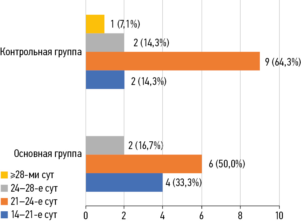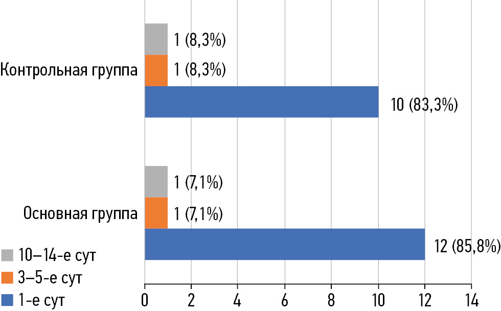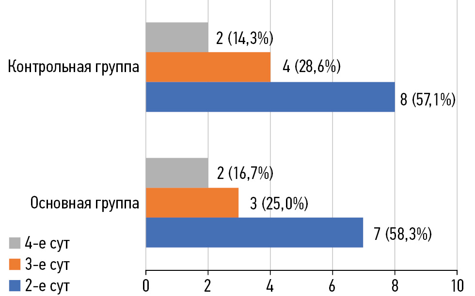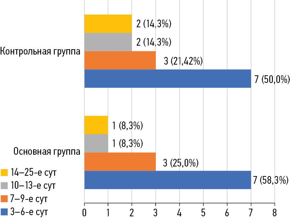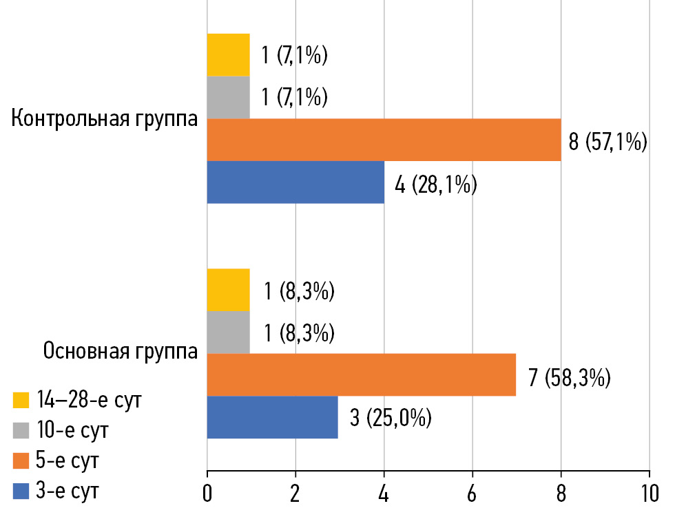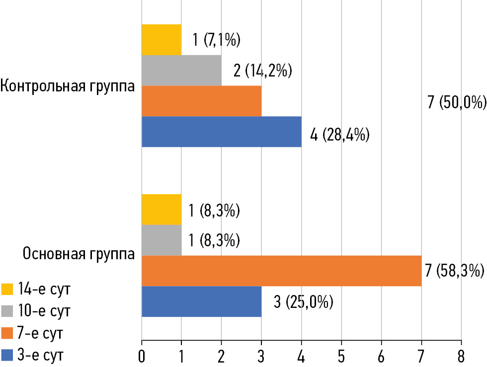 Сроки бактериологической санации у пациентов в основной и контрольной группе произошли в равный промежуток времени.