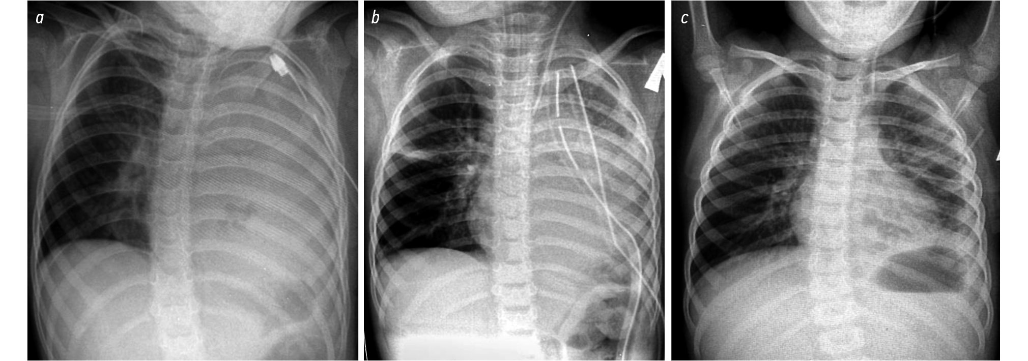 Fig. 10. Radiographs of the chest organs of patient G., 3 years old (control group): a — before surgery, b — on day 1 after surgery; c — on day 7 after surgery.
