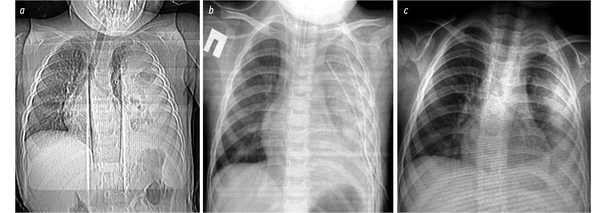 Рис. 9. Рентгенограммы органов грудной клетки больной К., 5 лет (основная группа): a — до операции, b — на 1-е сут после операции; c — на 7-е сут после операции.
