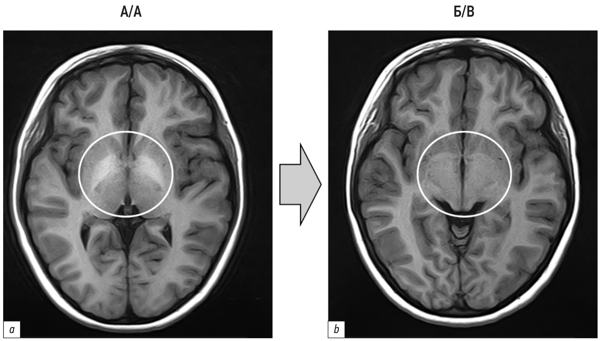 Рис. 1. Магнитно-резонансная томограмма головного мозга (купирование признаков накопления солей марганца у мальчика 11 лет): a — до операции; отложения марганца в виде симметричных гиперинтенсивных очагов в нижней части бледного шара (круг); b — через 11 мес. после операции; бледный шар без признаков накопления солей марганца (круг).