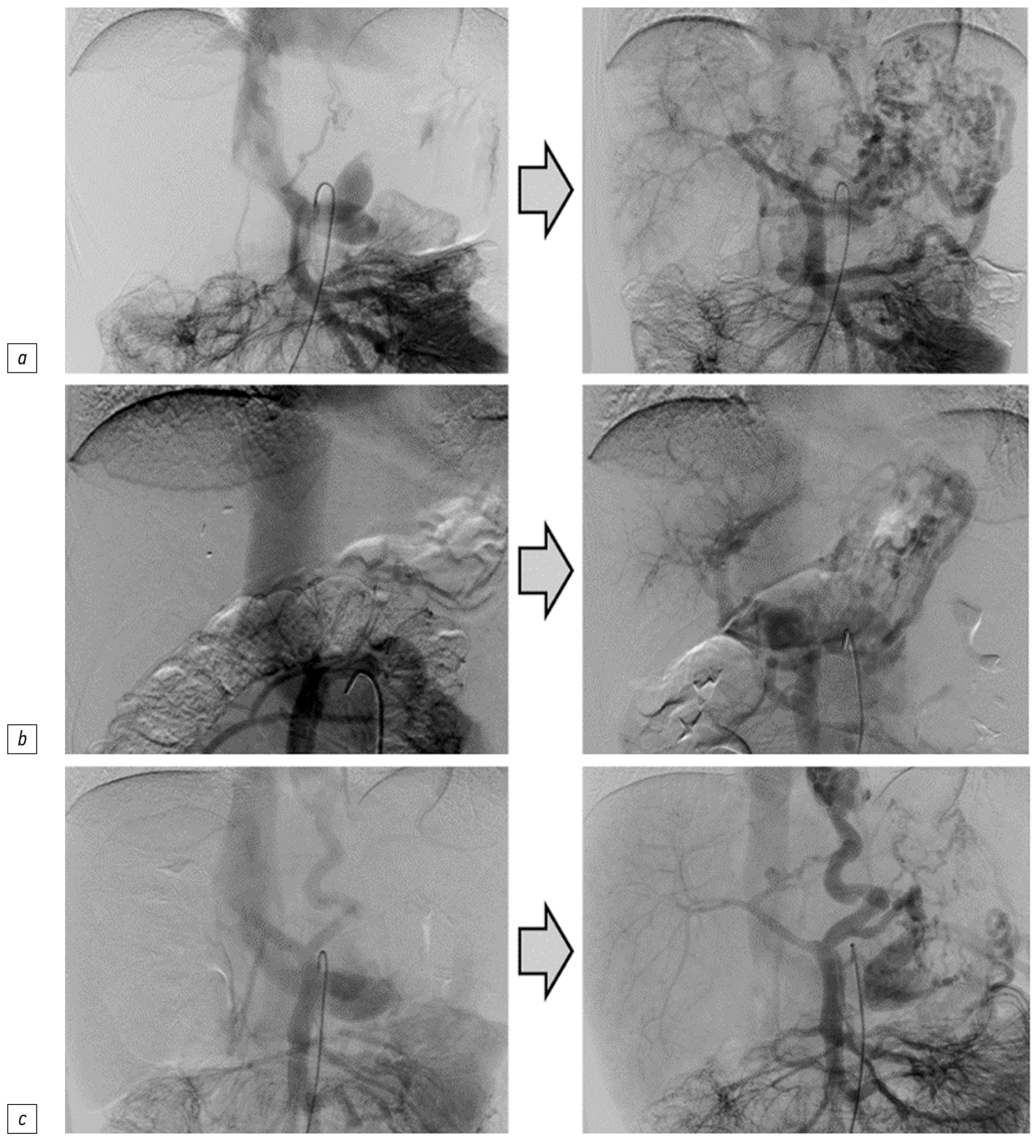 Рис. 2. Ангиограммы (венозные фазы целиакографий) до и после операции с улучшением портальной перфузии печени: a — мальчик 7 лет, b — девочка 11 лет, c — девочка 7 лет.