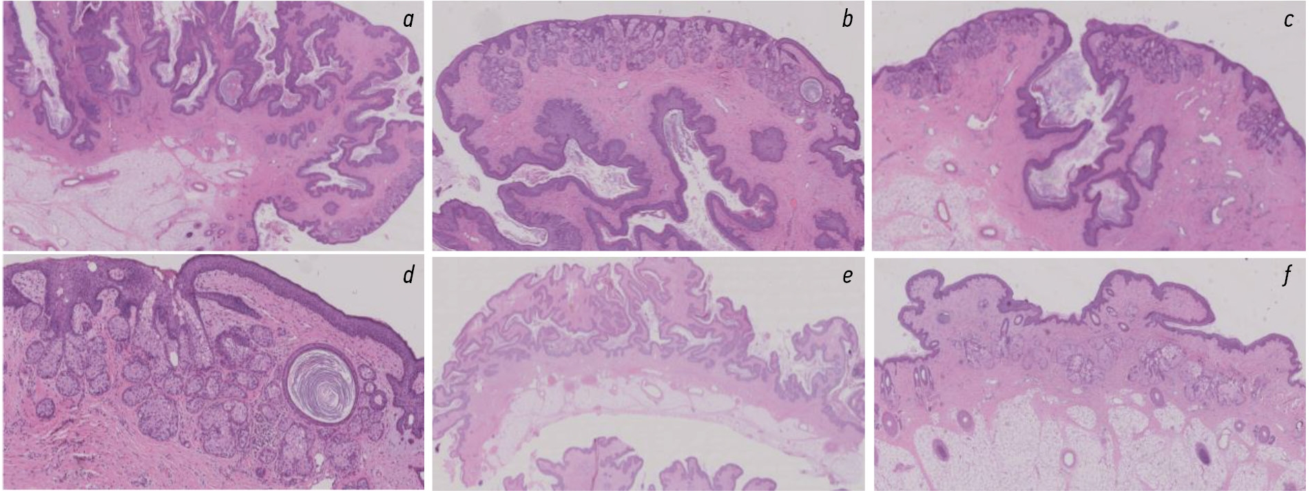 После предоперационного общеклинического обследования образование было частично удалено с целью гистологической верификации (рис. 2, рис. 3). По данным микроскопического исследования полученного материала, определялись изменения эпидермиса в виде выраженного папилломатоза (рис. 4, a, b, e), акантоза и гиперкератоза с образованием кератиновых псевдокист (рис. 4, a, b, d). Отмечалось наличие фокусов изъязвления эпидермиса и реактивной воспалительной инфильтрации (рис. 4, d, e). Особо обращало на себя внимание наличие большого количества гиперплазированных сальных желёз, расположенных интрадермально и значительно превышающих по количеству волосяные фолликулы (рис. 4, b–d, f). Таким образом, было сделано заключение о соответствии морфологической картины НЯ.