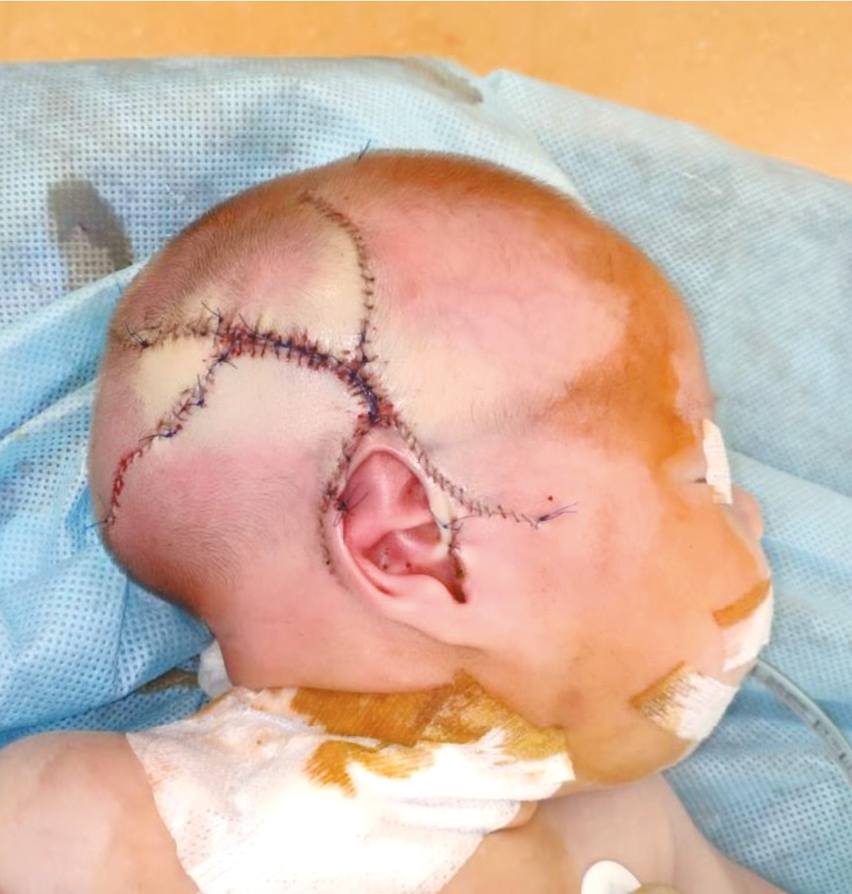 В возрасте 16-ти сут проведено радикальное удаление НЯ и выполнена реконструктивная пластика кожи головы на лоскутах с широким основанием (рис. 5). Послеоперационный период протекал гладко. При микроскопическом исследовании удалённых фрагментов образования отмечались патологические изменения, идентичные обнаруженным в раннее взятых биоптатах.