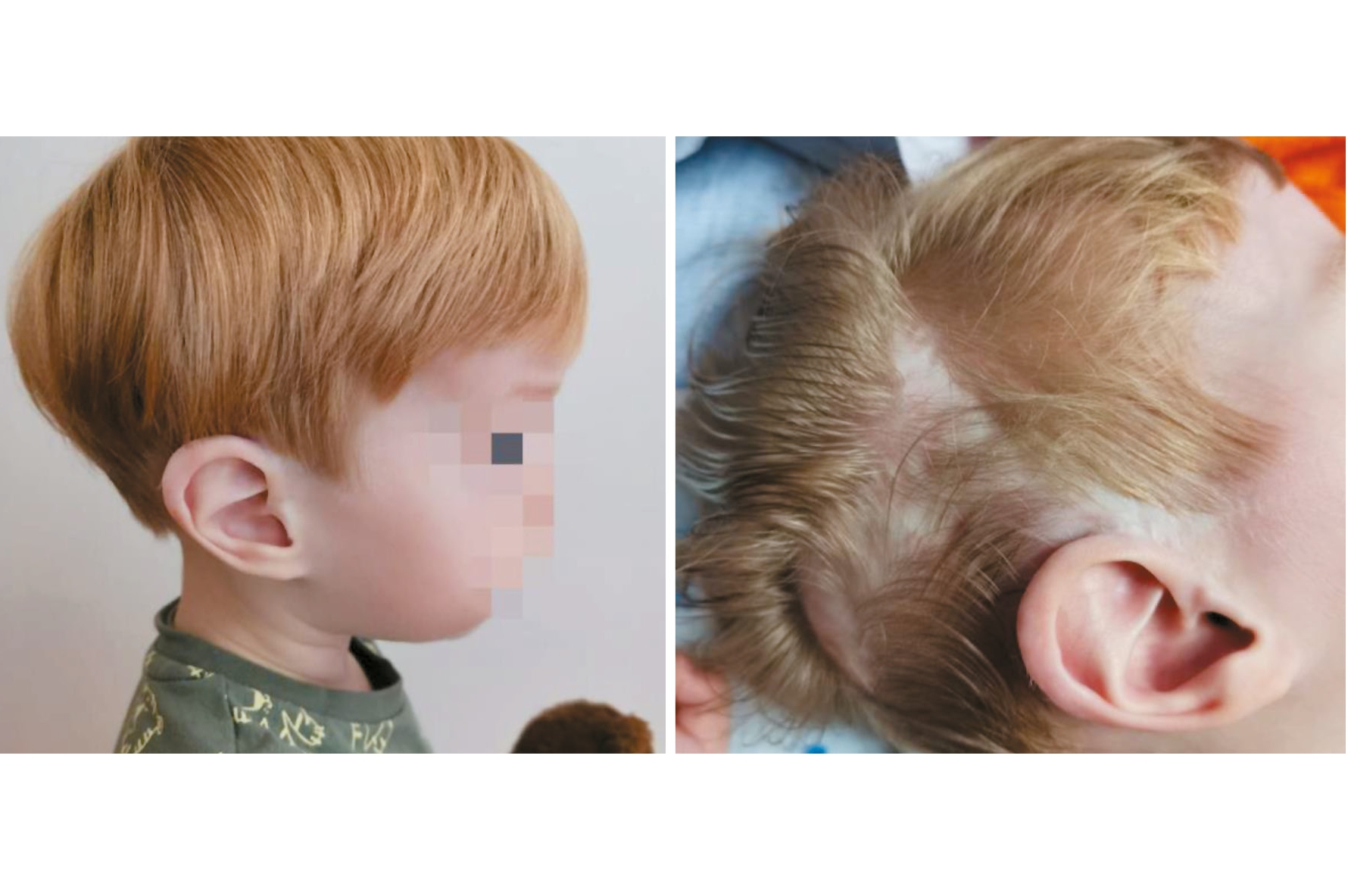 Рис. 6. Внешний вид ребёнка в возрасте 2 лет: a — при привычном положении головы рубец прикрыт волосами; b — нормотрофический рубец лямбдовидной формы в правой височно-теменной области.
