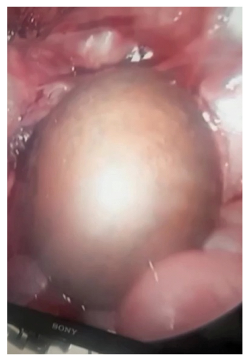 После дообследования 12.04.2022 в возрасте 4 мес. 10 дней выполнена лапароскопия. При ревизии брюшной полости слева определялась киста грязно-серого цвета размерами около 40×30 мм (рис. 2).