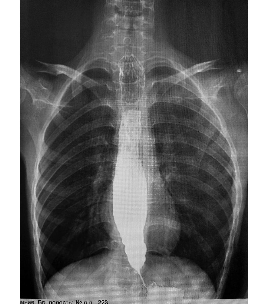 - контрастной эзофагографии, которая выявила характерные рентгенологические признаки АП: значительное расширение просвета пищевода, наличие в пищеводе остаточного содержимого, отсутствие отчётливого газового пузыря в желудке и признак «птичьего клюва»;