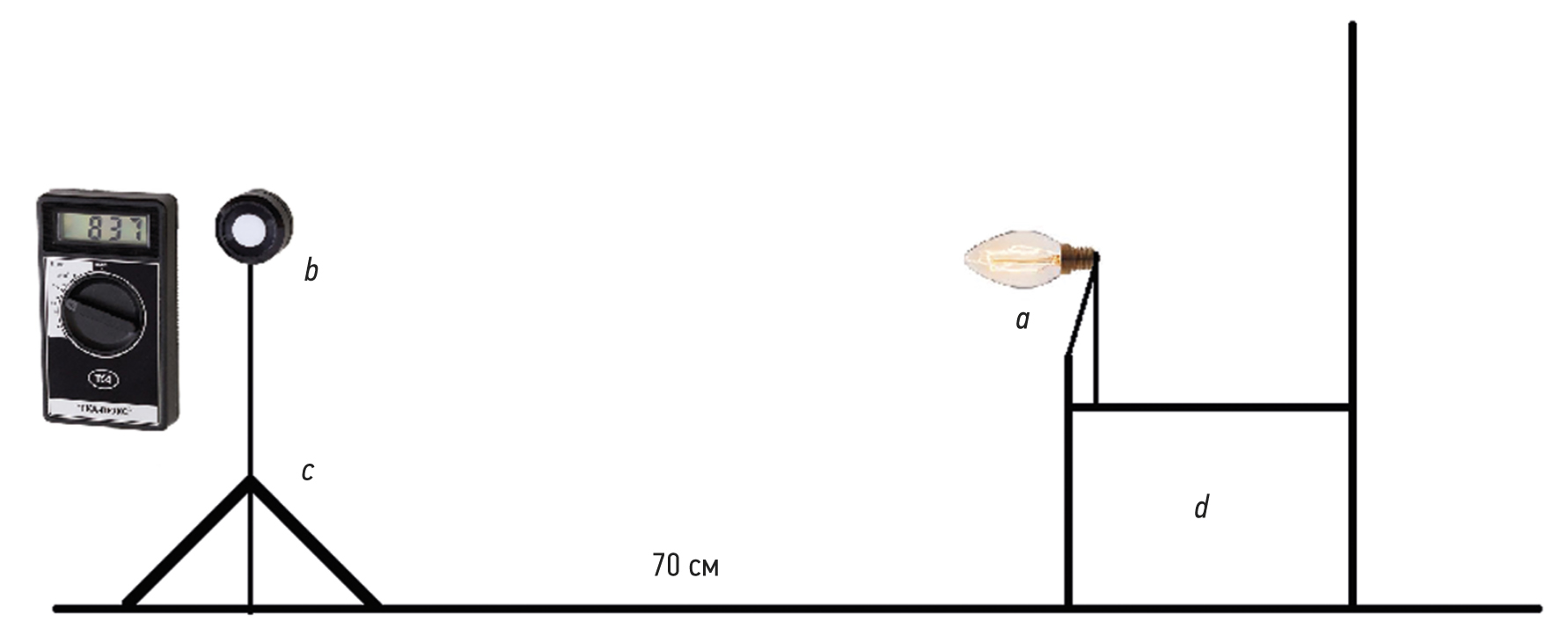 Рис. 1. Схема определения уровня освещённости: a — источник света, b — датчик люксметра, c — тренога, d — стол с закреплённым источником света