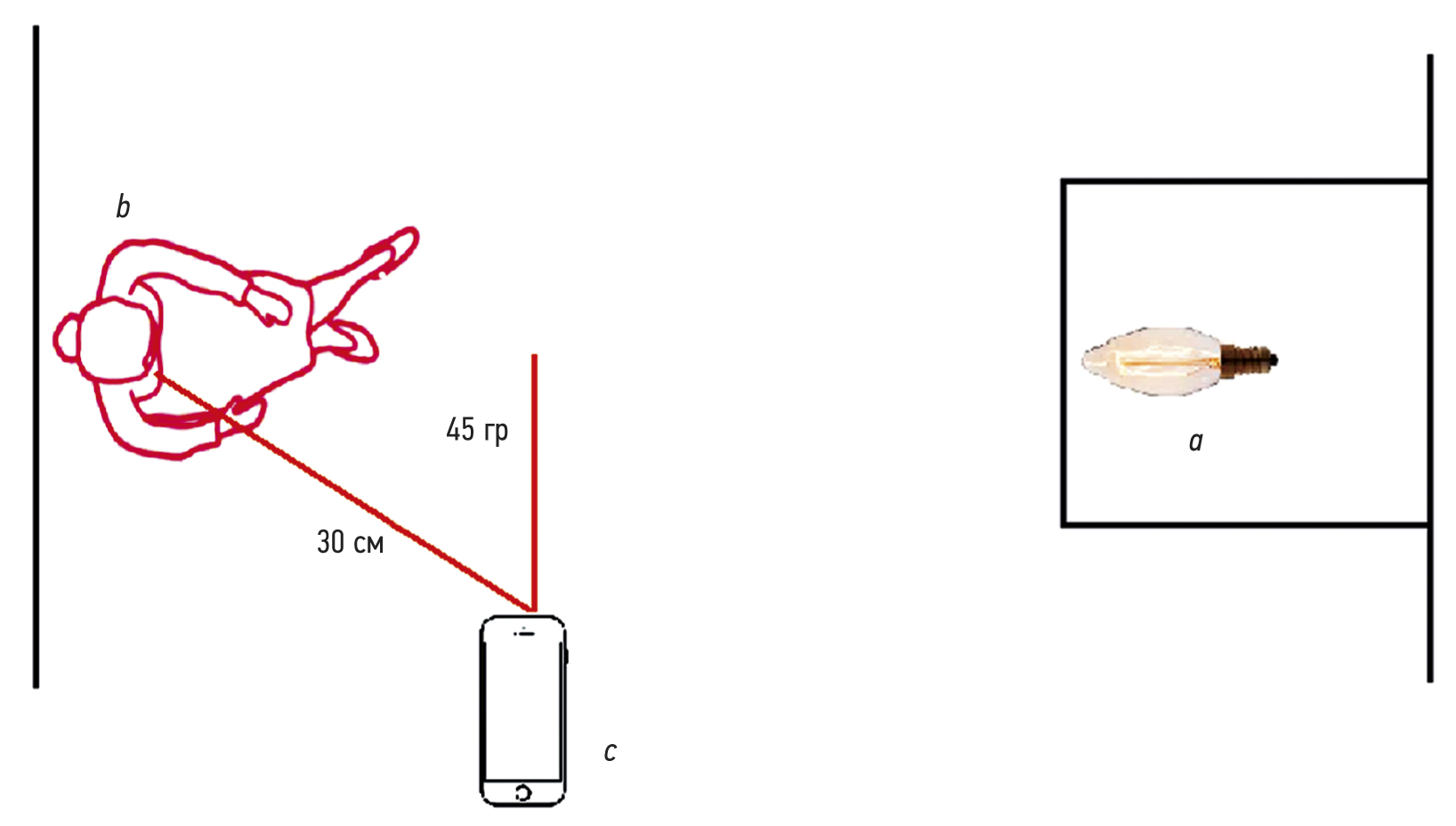 Рис. 2. Схема проведения фотосъёмки, вид сверху: a — источник света, b — участница, c — смартфон с встроенной фотокамерой