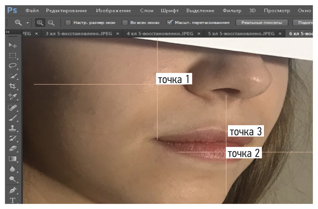 Таким образом, в ходе этого этапа эксперимента мы получили 14 фотографий каждой участницы. Всего 70 фотоснимков со следующими параметрами: тип файла — JPEG, разрешение фотоснимка 1536×2048 пикселей. Анализ полученных изображений проводили в цифровом графическом редакторе Adobe Photoshop CS 6 при помощи инструмента «цветовой эталон». На фотоснимках лиц участниц мы определили три точки для оценки цветовых координат. Схема забора точек для оценки представлена на рис. 3. Точка 1 — на пересечении двух взаимно перпендикулярных прямых: вертикальная линия проходила через угол рта ближний к фотокамере, а горизонтальная — пересекала наиболее отдалённую точку крыла носа. Точка 2 — на пересечении двух взаимно перпендикулярных прямых: вертикальная линия проходила через колумеллу носа, а горизонтальная — через середину красной каймы нижней губы. Точка 3 — на прямой, проходящей через середину арки купидона.