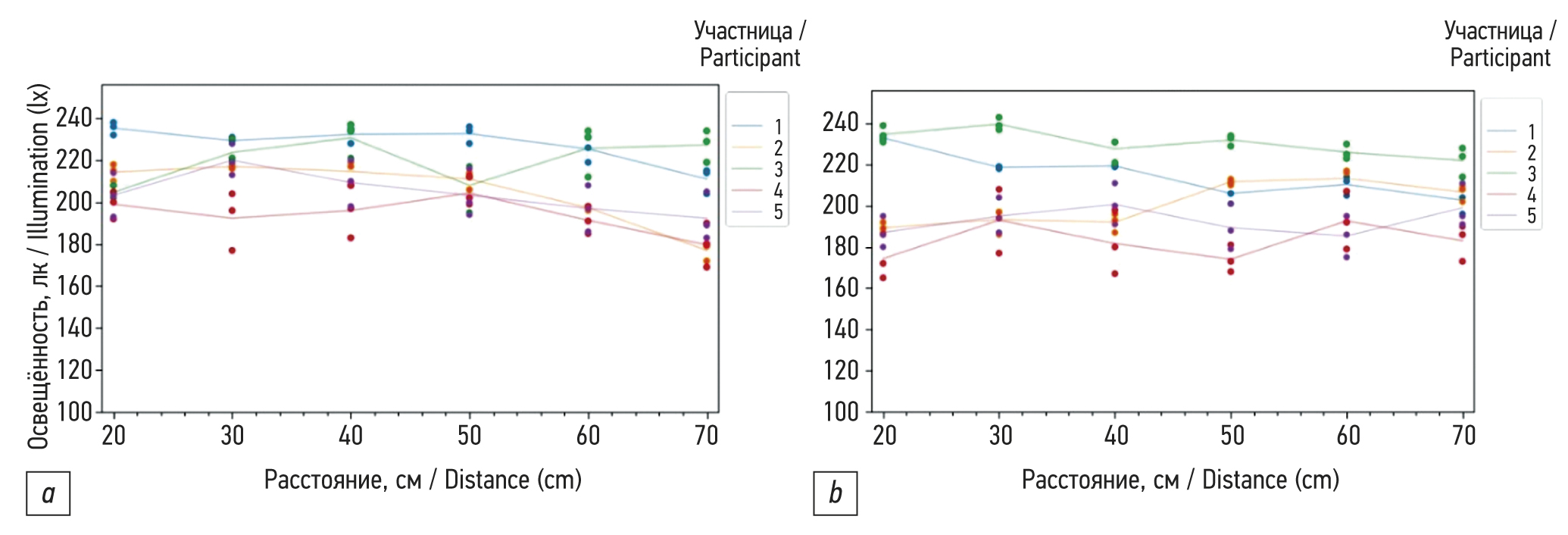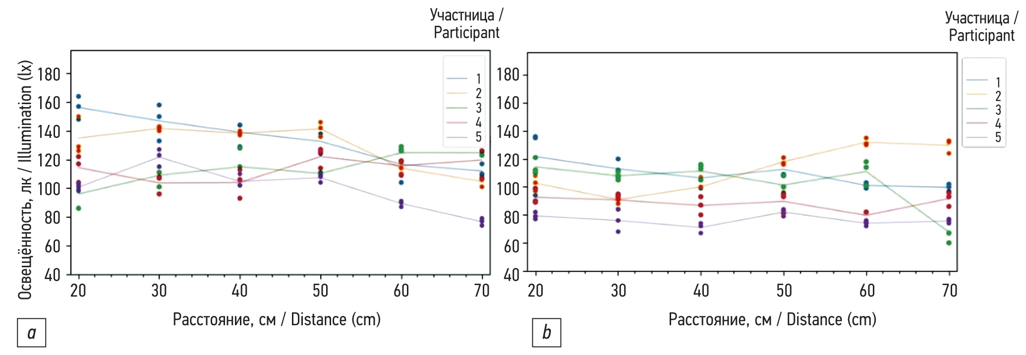 Анализ полученных данных свидетельствовал о том, что на минимальном расстоянии от источника света уровень освещённости был максимальным. Ожидаемо, чем дальше измерительный прибор находился от источника света, тем ниже становились показатели освещённости, вне зависимости от типа источника. Данная динамика была заметна даже невооружённым глазом и закономерно подтвердилась в измерениях. Абсолютные числовые значения на одинаковых расстояниях измерения оказались сходными. Это, по всей видимости, обусловлено одинаковой мощностью источников света, а различия укладывались в погрешность люксметра. На расстоянии 30 см получен идентичный показатель в 558 лк. Расстояние для измерений имело равный шаг удаления от источника света в 10 см, однако значения уровня освещённости менялись неравномерно. Так, при измерении на 20–30 см зафиксировано «падение» почти на 50%, на 40–50 см — на 35–37%, на 60–70 см — на 25–26%. Таким образом, можно зафиксировать следующую измерительную тенденцию: относительный показатель уровня освещённости находится в нелинейной зависимости от расстояния между объектом и источником освещения.