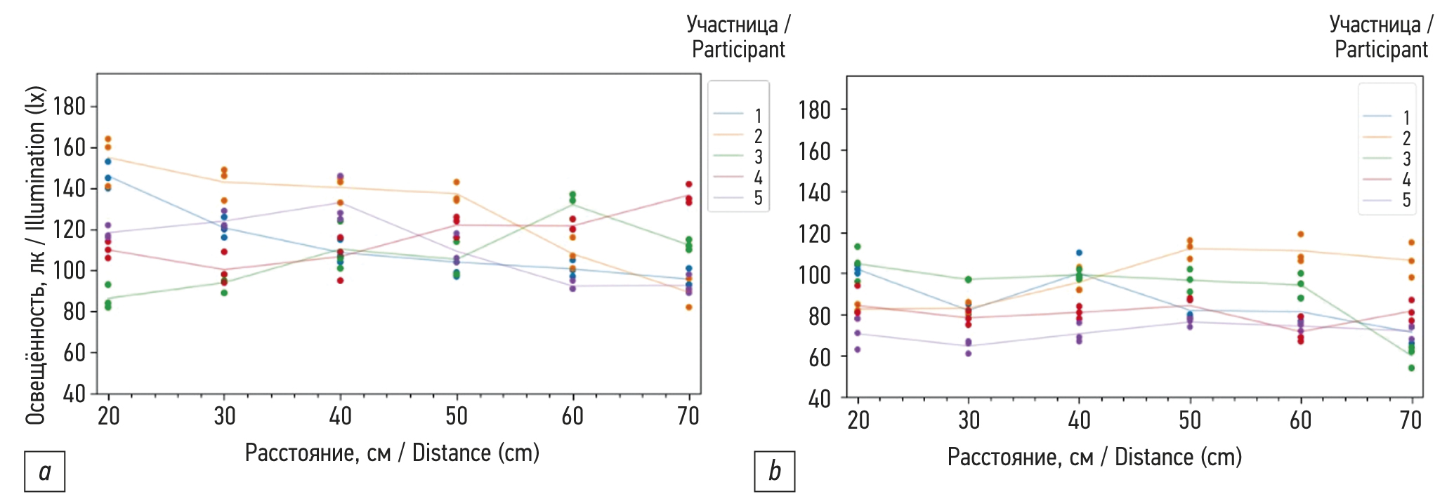 Рис. 5. Изменение цветовой координаты «G» в точке 2 в зависимости от расстояния: a — холодный свет, b — тёплый свет