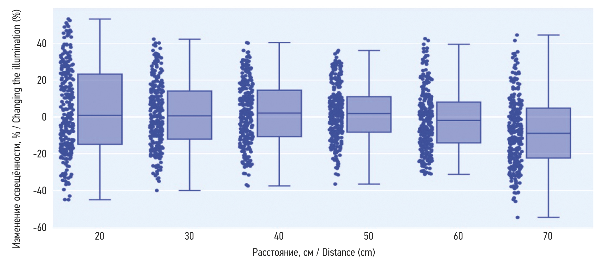 Медиана множеств абсолютных значений цветовых координат, полученных при фотофиксации на расстоянии 20 и 70 см, ниже оставшихся. Это подтверждается после анализа данных по методике ANOVA (p=1.975). Выполнен тест Тьюки для сравнения множеств между собой. Между множествами значений 20–60, 20–70, 30–70, 40–70, 50–70, 60–70 см имеют место статистически значимые различия (p=0.001). Таким образом значения абсолютных величин в выборках, взятых на расстоянии фотосъёмки 30–60 см, распределены равномерно.