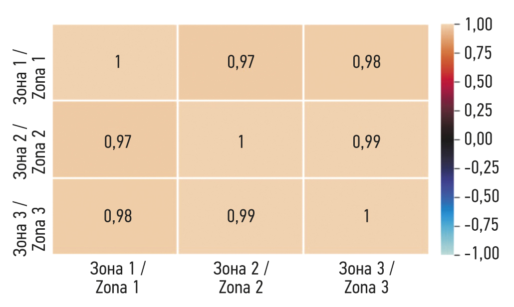 Аналогичным образом можно построить графики для любой пары цветовых координат, где их значения будут располагаться на одной прямой, так как все зоны между собой имеют прямую сильную корреляцию (R2=0,95, p <0,05).