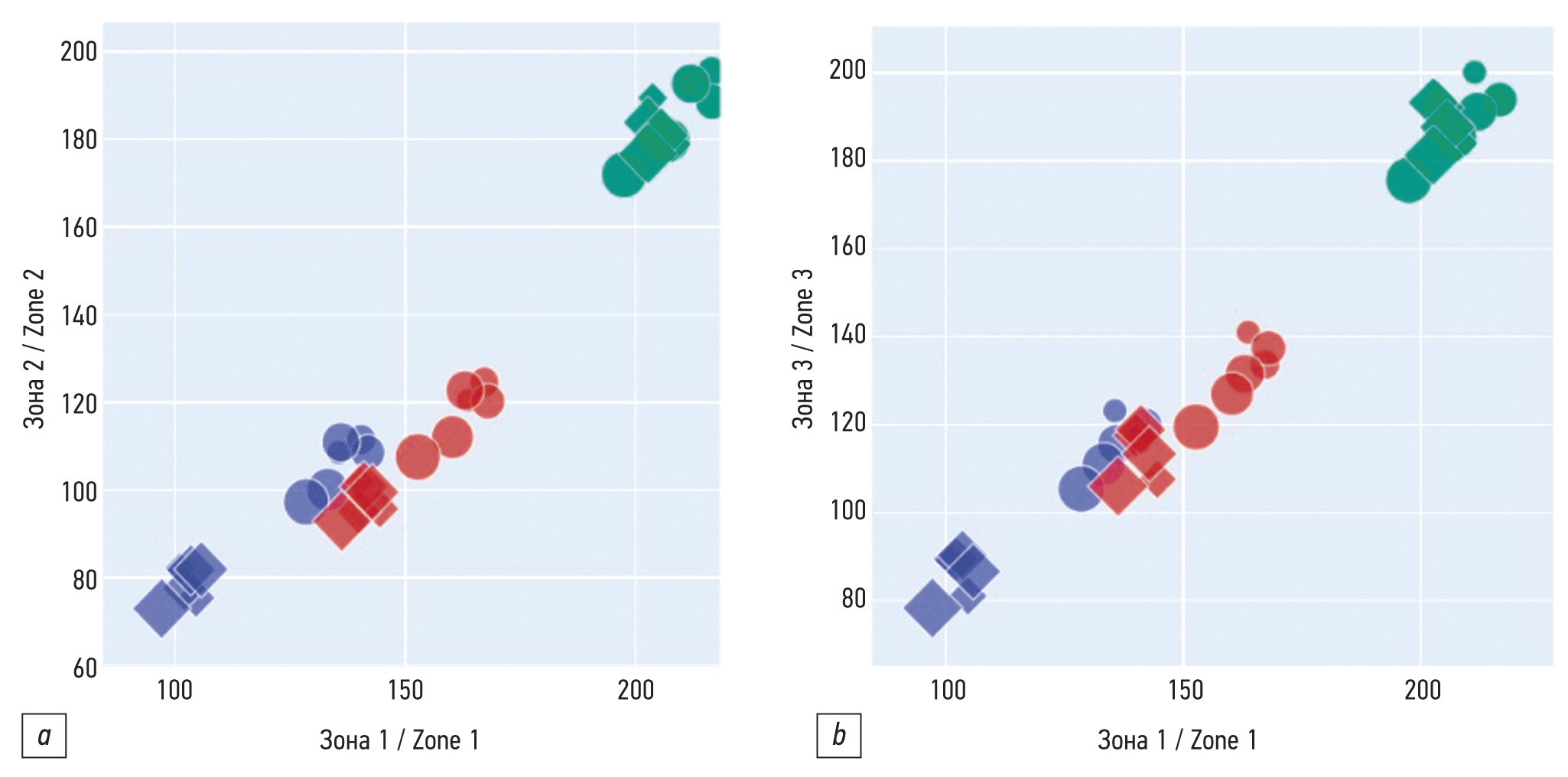 Данные имели сильную прямую корреляцию между собой вне зависимости от зоны исследования. При построении линейного графика, координаты любой из зон располагались на одной прямой (рис. 9). Аналогично можно выполнить построение графиков для любой цветовой зоны с сохранением результата. Символами на графике обозначены следующие исследуемые единицы: цвет определяет одноименные параметры в системе RGB; круг — координаты, полученные после анализа данных лампы тёплого света; ромб — координаты, полученные после анализа данных лампы холодного света; размеры фигур — расстояние от источника освещения.