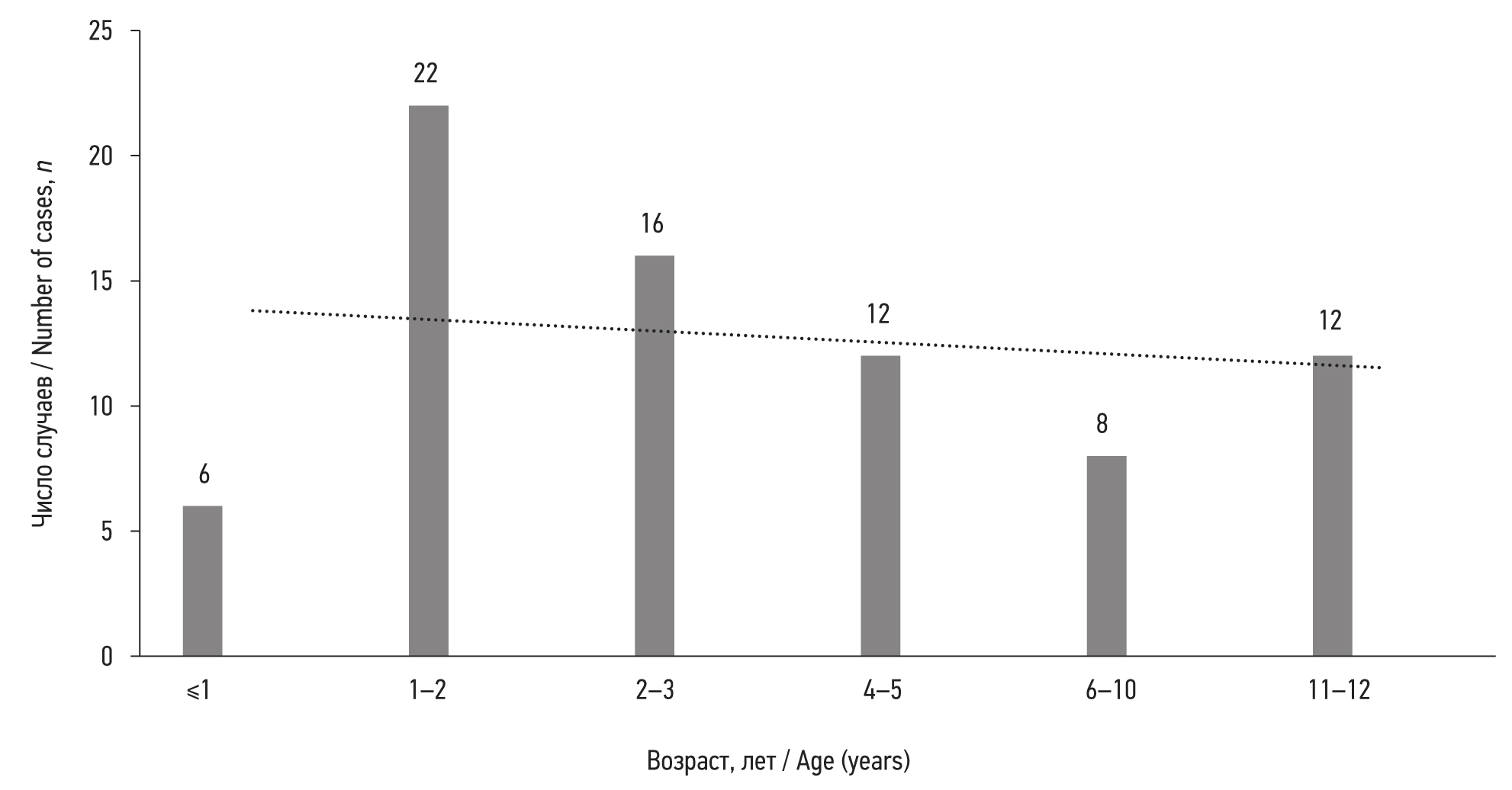 Средний возраст составил (4±3,65) лет, причём 44 ребёнка (58%) были младше 3 лет. Характерно, что возрастной пик приходился на возраст 1–2 года — 22 ребёнка (28,9%) и 2–3 лет — 16 (21%) детей. В дальнейшем частота последовательно снижалась (рис. 1). Соотношение полов — 30 (39,5%) девочек и 46 (60,5%) мальчиков — в разные возрастные периоды не имеет статистически достоверных различий. Информативный анамнез, указывающий на факт проглатывания инородного тела, констатирован в 46 (60,5%) случаях.