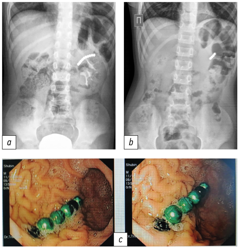 Рис. 2. Больной Ш (6 лет), длительность заболевания 7 сут: a — обзорная рентгенограмма органов брюшной полости (цепочка из 11 магнитных инородных тел в проекции желудка); b — контрольный снимок после эзофагогастродуоденоскопии (оставшиеся 4 магнитных инородных тела в сальниковой сумке); c — эндоскопическая картина расположения инородных тел в желудке (7 шариков удалены с преодолением магнитной силы, оставшиеся 4 расположены в сальниковой сумке)