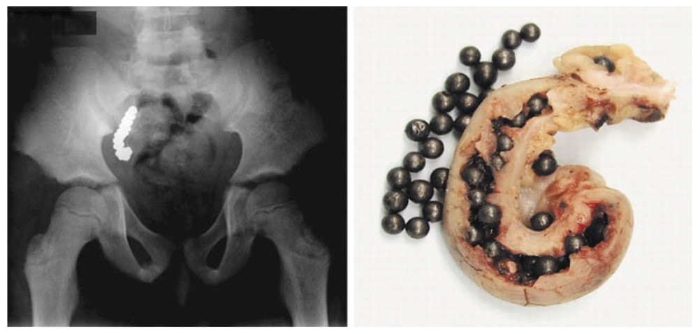 Инородные тела желудочно-кишечного тракта (ЖКТ) являются относительно «безопасной» проблемой детской хирургии — более 90% получают лечение амбулаторно, у более чем 90% госпитализированных лечение ограничивается наблюдением, либо эндоскопическим удалением, осложнения отмечаются менее чем у 1% пациентов [1]. От общего числа хирургических пациентов данная категория составляет 0,12%, а от пациентов с острыми заболеваниями органов брюшной полости — 0,37% [2]. Среди инородных тел длительное время элементы питания считались едва ли не самой опасной разновидностью. В 1995 году в Японии было опубликовано первое сообщение о магнитных инородных телах, а в дальнейшем проблема получила более широкое распространение [3]. В период 2002–2011 гг. частота встречаемости магнитных инородных тел в США увеличилась в 8,5 раз, данная тенденция характерна и для других территорий [4].
