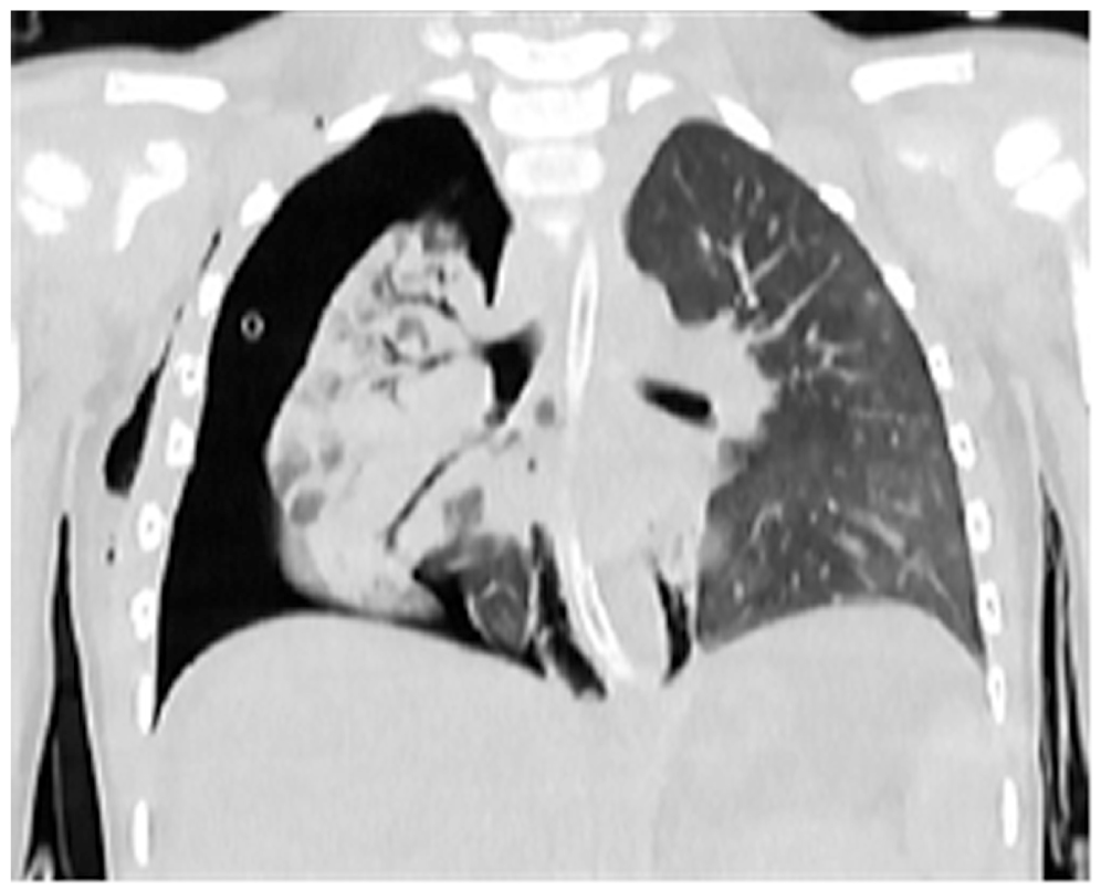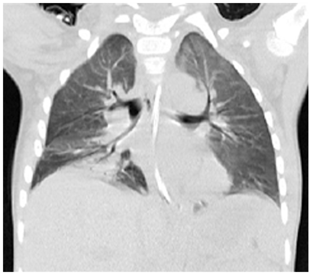 При поступлении выполнена спиральная компьютерная томография (СКТ) в режиме «Whole body». На основании клинико-инструментального обследования с учётом анамнестических данных и данных первичного стационара был сформулирован диагноз: «Тяжёлая сочетанная травма [оценка по шкале тяжести травмы (Injury Severity Score) 41 балл]; закрытая тяжёлая ЧМТ [по шкале оценки тяжести изолированных повреждений (Abbreviated Injury Scale, AIS) AIS-4]; ушиб головного мозга тяжёлой степени; перелом левой височной, теменной и затылочной костей; закрытая травма груди (AIS-4); множественные переломы рёбер (2–8) справа; ушиб левого лёгкого средней степени тяжести; разрыв правого лёгкого; большой напряженный пневмоторакс справа (AIS-4); закрытая травма живота (AIS-3); разрыв правой доли печени; гемоперитонеум; травматический шок 3 степени». Ребёнок был госпитализирован в отделение реанимации, где продолжена интенсивная терапия. Тяжесть состояния ребёнка была обусловлена тяжестью травматических повреждений с развитием множественной органной дисфункции в рамках синдрома взаимного отягощения. По плевральным дренажам сохранялось продувание воздуха, аускультативно определялось ослабление дыхания над всей поверхностью правого лёгкого. По данным СКТ при поступлении и рентгенографии органов грудной клетки, выполняемой ежедневно в палате отделения реанимации, сохранялось коллабирование правого лёгкого от ⅓ до ⅔ (рис. 1).