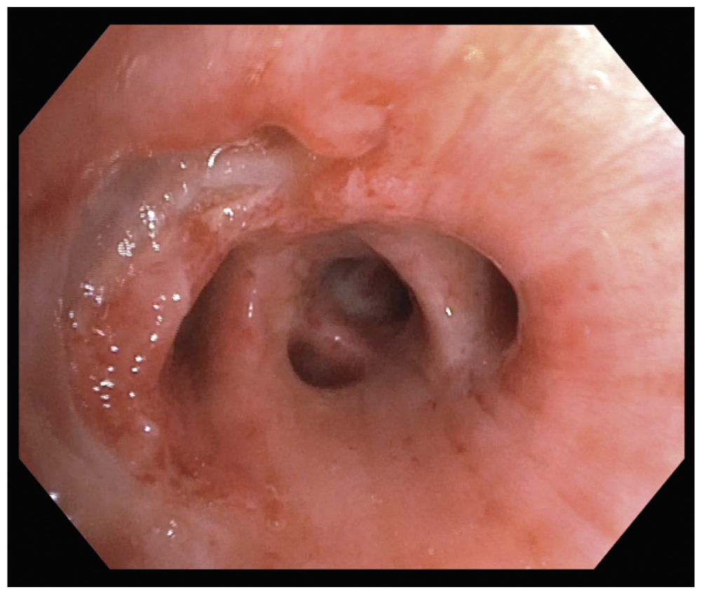 На фоне проводимой терапии, включая ИВЛ, к 5-м сут посттравматического периода отмечена положительная динамика в виде устойчивой стабилизации гемодинамики без вазопрессорной поддержки. Однако продувание воздуха по дренажам сохранялось. На фоне использования интермиттирующего (пассивного и активного) режима аспирации не удавалось достичь устойчивого полного расправления паренхимы правого лёгкого. Газовый состав крови сохранялся субкомпенсированным, сатурация 90–95% с периодами снижения до 80–84%. Учитывая стабилизацию гемодинамических показателей консилиумом реаниматологов, хирургов и врачей-эндоскопистов было принято решение выполнить диагностическую ларинготрахеобронхоскопию (ЛТБС) для определения возможности установки бронхоблокатора с целью окклюзии бронхопульмонального свища. ЛТБС проводили в условиях операционной под общей анестезией, через воздуховод I-GEL бронхоскопом 4,9 мм с инструментальным каналом 2,0 мм. Манипуляцию проводили под рентгенологическим контролем (электронно-оптический преобразователь — С-дуга). Для предотвращения бронхоспазма голосовые складки и карину дополнительно орошали 2% раствором лидокаина гидрохлорида моногидрата в возрастной дозировке. В просвете трахеобронхиального дерева, больше справа, выявлено значительное количество вязкой густой слизи с примесью крови. Выполнена санация трахеобронхиального дерева с промыванием антисептическим раствором с последующим детальным осмотром всех видимых бронхов левого и правого лёгкого. По передней стенке промежуточного бронха визуализирован линейный разрыв 9×3 мм с неровными краями (рис. 2).