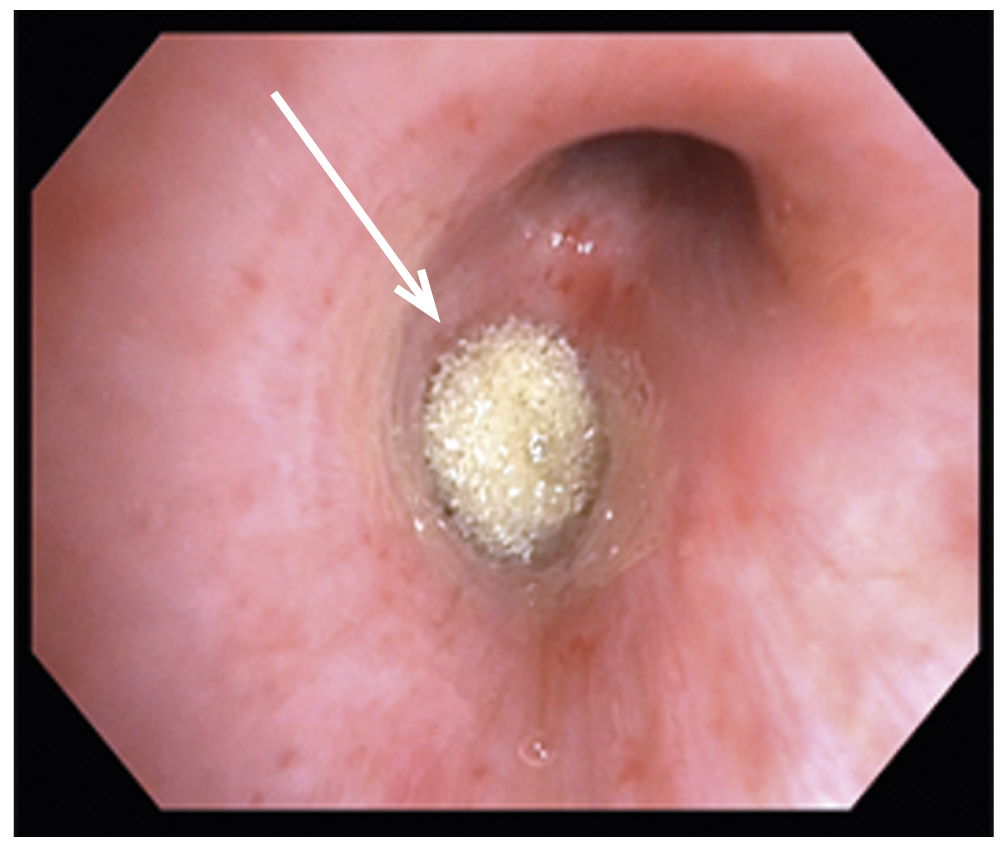 Рис. 3. Эндоскопическая картина: окклюзия промежуточного бронха бронхоблокатором (стрелка — полиуретановая медицинская губка).