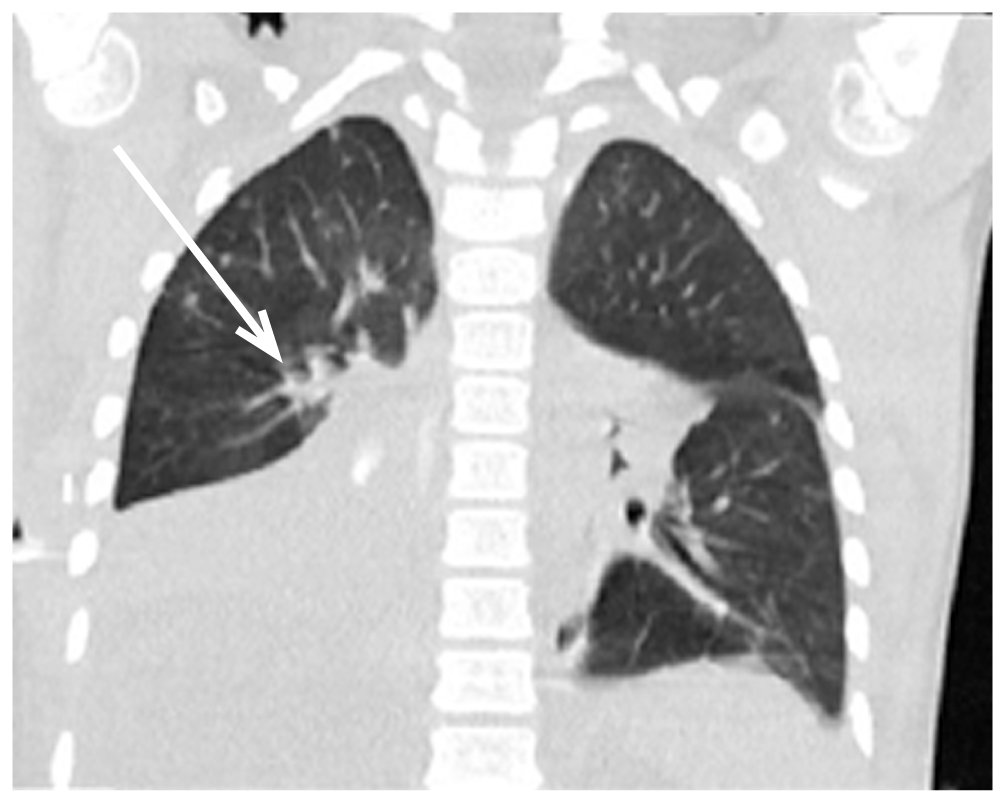 Рис. 4. Спиральная компьютерная томография на 6 сут после ларинготрахеобронхоскопии: ателектаз средней и нижней долей правого лёгкого (стрелка).