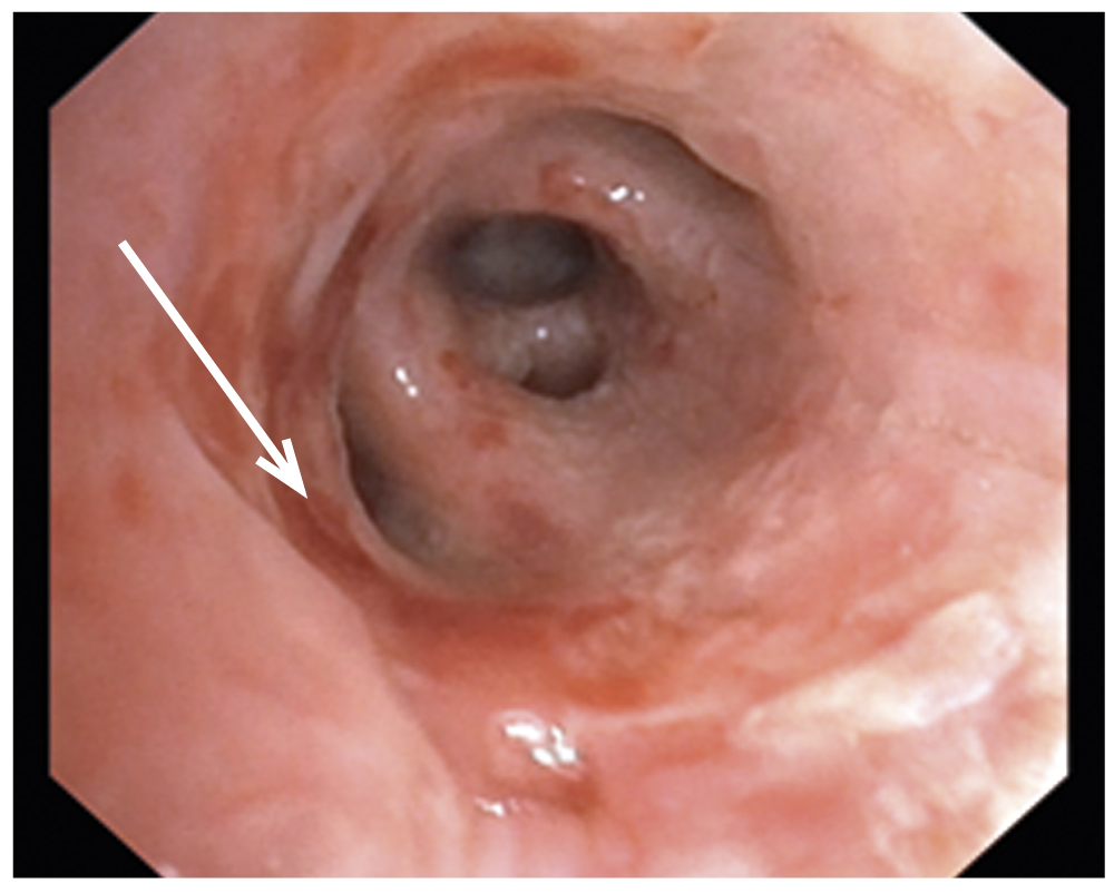 Рис. 5. Эндоскопическая картина после удаления бронхоблокаторов: эпителизация травматического разрыва промежуточного бронха (стрелка).