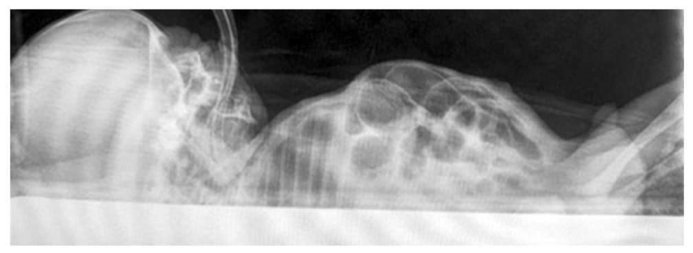 Ребёнок Ш., 11 сут. Родился 06.09.2023 путём кесарева сечения от 1-х родов на 30-й неделе беременности. Масса тела при рождении — 1200г, длина тела 36 см, оценка по шкале Апгар 5/7 баллов. Находился в Республиканском перинатальном центре с диагнозом: врождённая инфекция, пневмония, дыхательная недостаточность III степени, респираторный дистресс-синдром у новорождённого, гипоксическая ишемическая энцефалопатия новорождённого. В связи с дыхательной недостаточностью ребёнок переведён на искусственную вентиляцию лёгких, на 3-сутки — на самостоятельное дыхание. На 9-е сутки — ухудшение состояния, пациент повторно переведён на искусственную вентиляцию лёгких. На консультацию приглашён детский хирург из РДКБ.