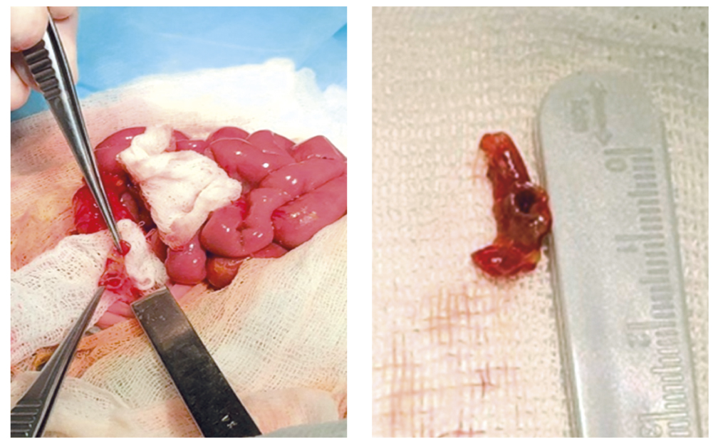 Крайне тяжёлое состояние обусловлено резким повышением внутрибрюшного давления. В связи с этим выполнен лапароцентез и дренирование брюшной полости, выделилось большое количество воздуха и мутного выпота желтоватого цвета. На фоне комплексной терапии дренирование брюшной полости позволило провести адекватную респираторную поддержку и стабилизацию гемодинамики, а также дало возможность уменьшить вздутие живота и застойное отделяемое из желудка. Состояние больного стабилизировалось. На 3-и сутки после постановки дренажа ребёнок переведён из перинатального центра в отделение хирургии новорождённых РДКБ. После предоперационной подготовки под общим обезболиванием с предположительным диагнозом «НЭК, перфорация полого органа, перитонит» 18.06.23 выполнена поперечная лапаротомия слева, выделился гнойный выпот с примесью кишечного содержимого. Петли тонкой кишки отёчны, гиперемированы, покрыты фибрином. При ревизии выявлен перфоративный аппендицит, в средней трети отростка обнаружено перфорационное отверстие размером 0,3×0,2 мм (рис. 2), откуда поступает кишечное содержимое и воздух. На остальном протяжении отросток не изменён. Проведена аппендэктомия лигатурным способом и санация брюшной полости. Наложены послойные швы на рану нитью (викрил 4-0).