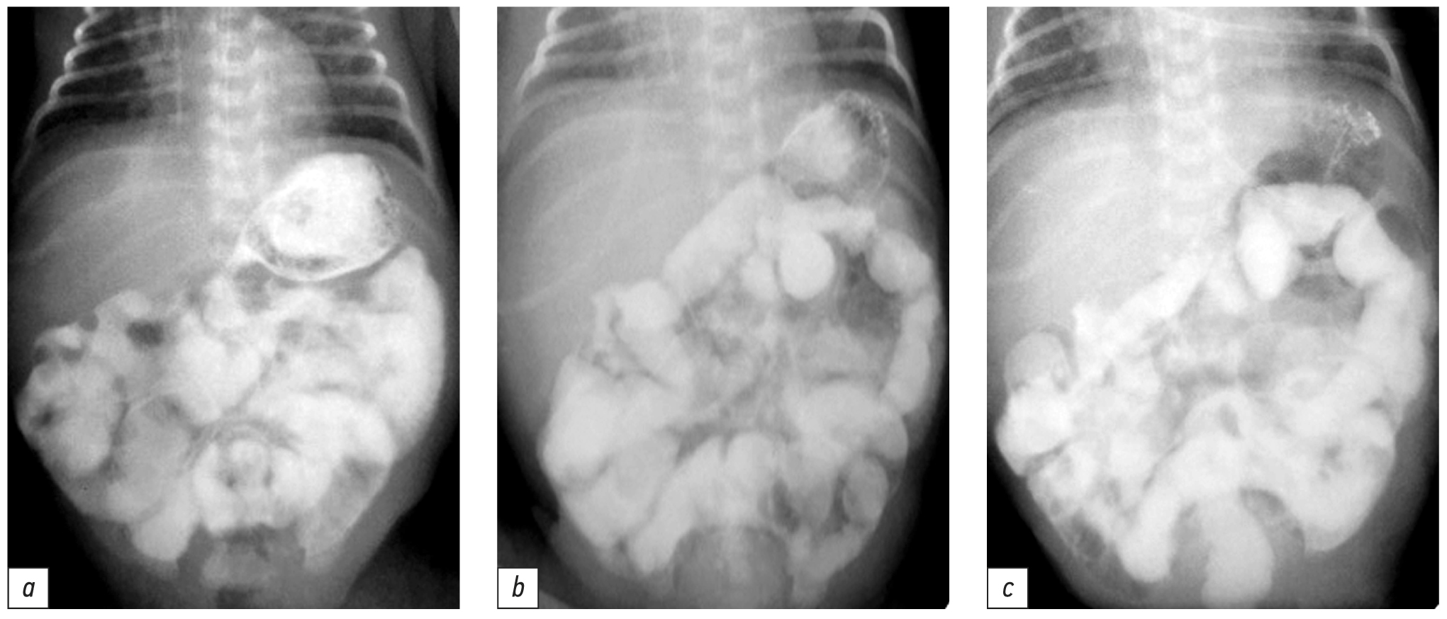 Рис. 3. Пассаж контраста по кишечнику через 1 (a), 3 (b), 6 (c) ч после введения (данных за непроходимость кишечника нет).