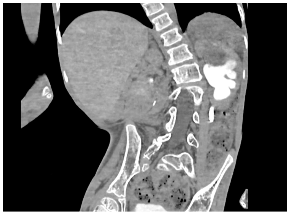 Ребёнок с рождения страдал неврологическими расстройствами в виде спастической квадриплегии в результате перенесённой во время родов асфиксии. Заболевание сопровождалось выраженной деформацией скелета в виде сколиоза и нейрогенными нарушениями отведения мочи. Предоперационная рентгенологическая оценка анатомии и функции почек включала ультразвуковое исследование (УЗИ) почек и мочевого пузыря, контрастную компьютерную томографию (КТ) почек и микционную цистоуретрографию (МЦУГ). С помощью УЗИ, КТ и МЦУГ оценили степень дилатации почечной лоханки и мочеточника левой почки, а также наличие камня на уровне проксимального отдела мочеточника. Лоханка левой почки была расширена до 50 мм, как и мочеточник, отходящий от неё, диаметром до 15 мм. Размеры камня составляли 18 × 10 мм. Предполагалось, что камень образовался на фоне периодических задержек мочеиспускания на фоне основного заболевания поражения центральной нервной системы. Детальное изучение КТ-сканов указало на наличие стриктуры мочеточника, расположенной сразу над камнем (рис. 1). Мочеточник ниже камня не был расширен. По данным МЦУГ везикоренальный рефлюкс не определялся. Данные радионуклидного исследования обнаружили снижение почечной функции слева до 40%.